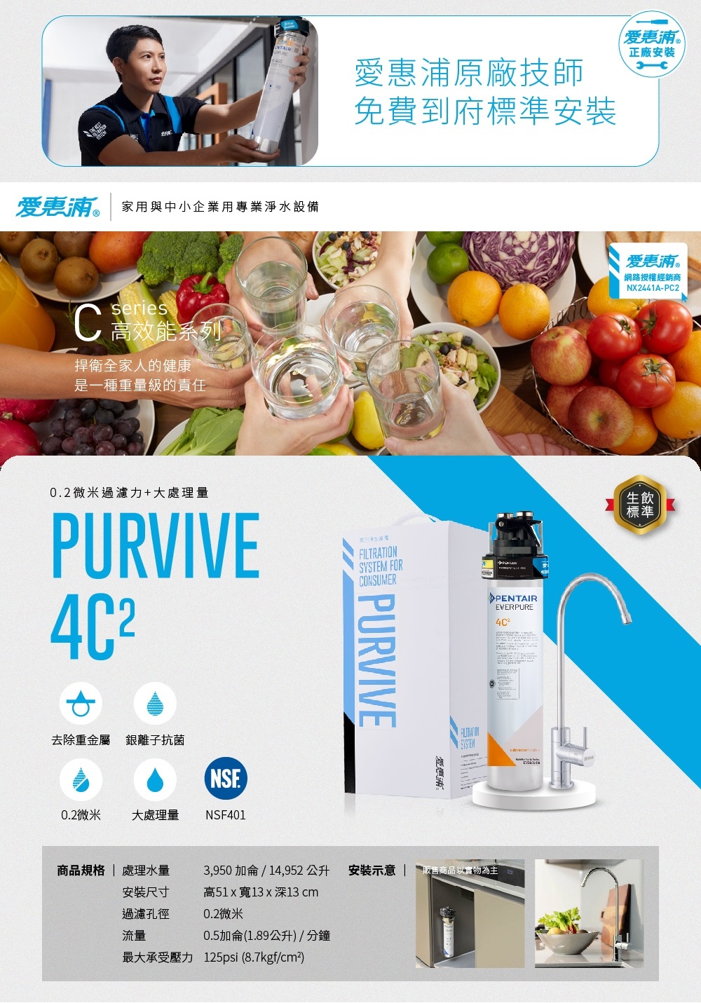 • 【EVERPURE 愛惠浦】 PURVIVE Duo-4C2 櫥下型兩道式生飲淨水器 (中空絲膜) 《原廠技師安裝/ 贈基本安裝》