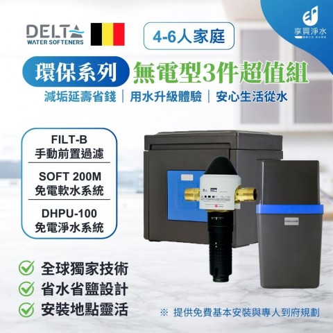 Delta HYDROSOFT 200M 免電力軟水機+ Delta DHPU-100 全屋除氯設備+手動前置過濾 (全戶三件組)