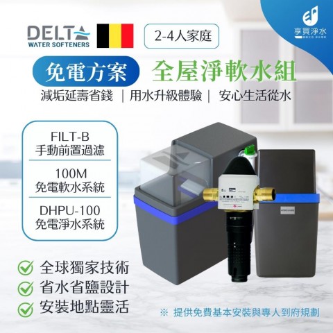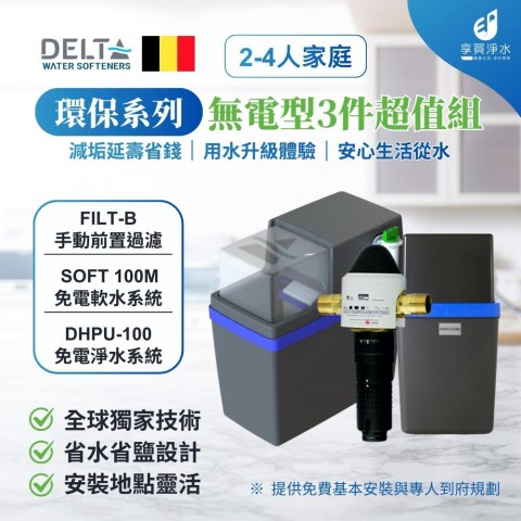 Delta HYDROSOFT 100M 免電力軟水機+ Delta DHPU-100 全屋除氯設備+手動前置過濾 (全戶三件組)